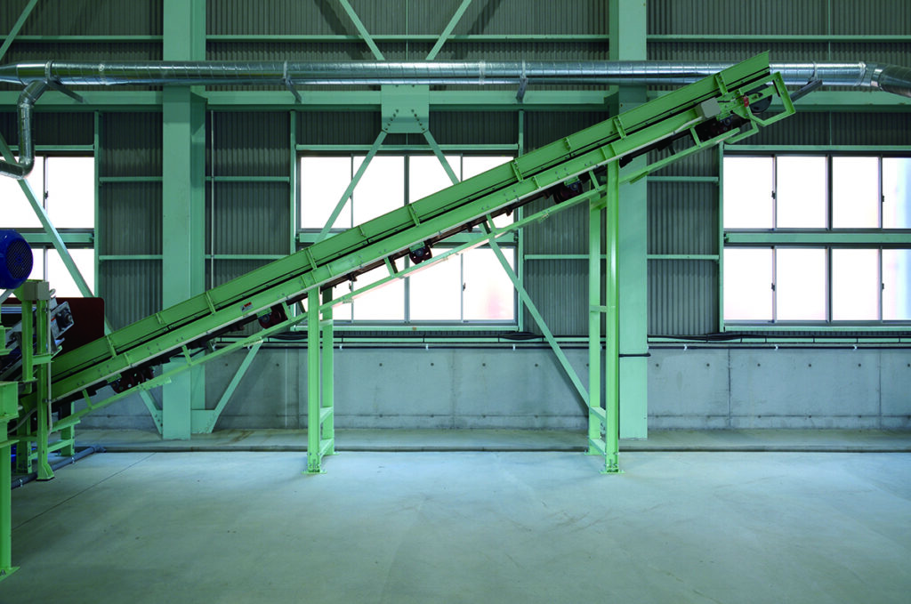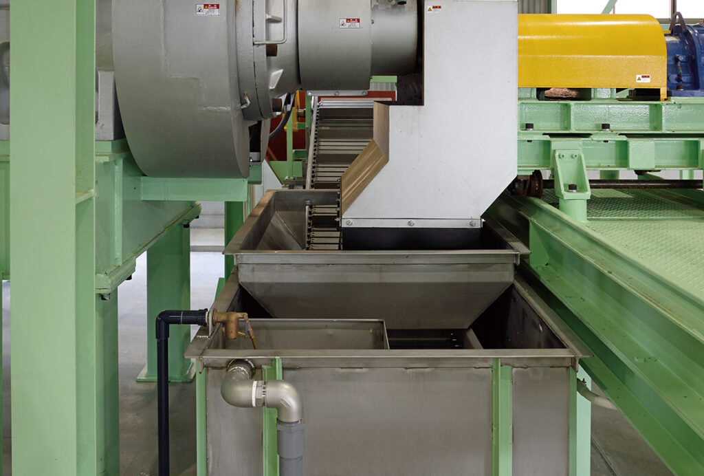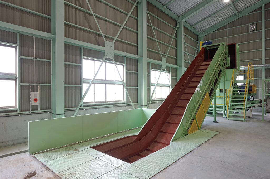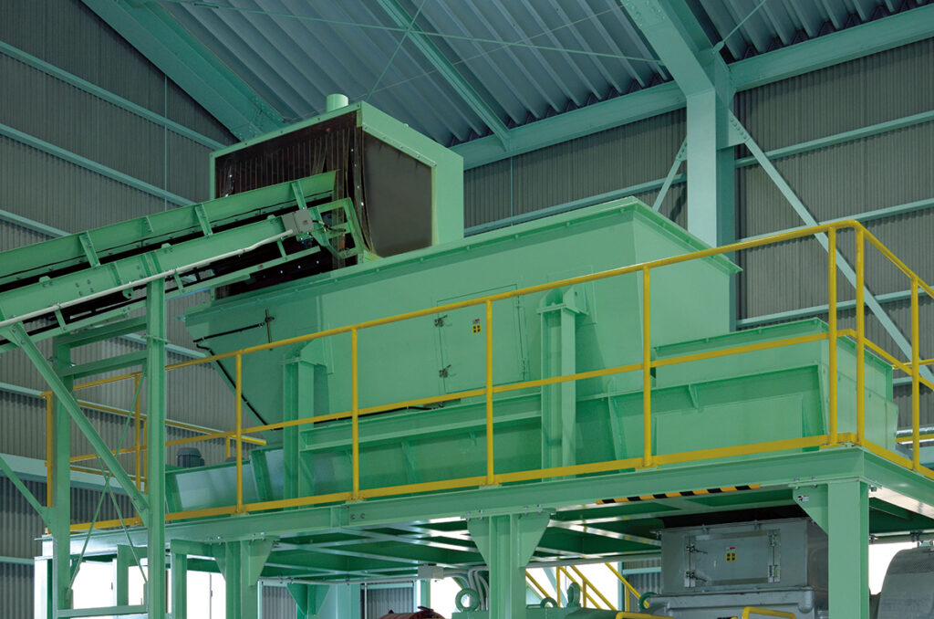 エプロンコンベアー比較的大きな産業廃棄物を、可変式の自動投入コンベアで効率良く破砕機へ投入します。